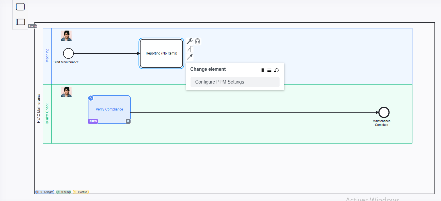 Design and visualize maintenance processes using BPMN.js. Create swimlane-based workflows, attach packages, and define execution strategies (sequential, parallel, priority-optimized). Monitor real-time execution and optimize with SentrixAI.